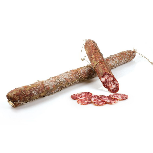 La corallina è un tipo di salame italiano tradizionale noto per la sua forma caratteristica e il suo sapore unico. È originario della regione dell’Emilia-Romagna ed è spesso considerato un salame di alta qualità. Il salame corallina ha un sapore complesso e ricco, con una buona dose di piccante dovuta al pepe. Prende il suo nome dal budello di insacco detto “Corallo”, raggiunge la lunghezza di 90cm. Il suo grasso intramuscolare contribuisce a una consistenza morbida e succosa, viene realizzato con polpa magra di suino e la particolarità di lardelli di grasso a cubetti sparsi un po’ per tutta la fetta. Viene spesso consumato da solo come antipasto o tagliato a fette sottili e servito con formaggi e pane.